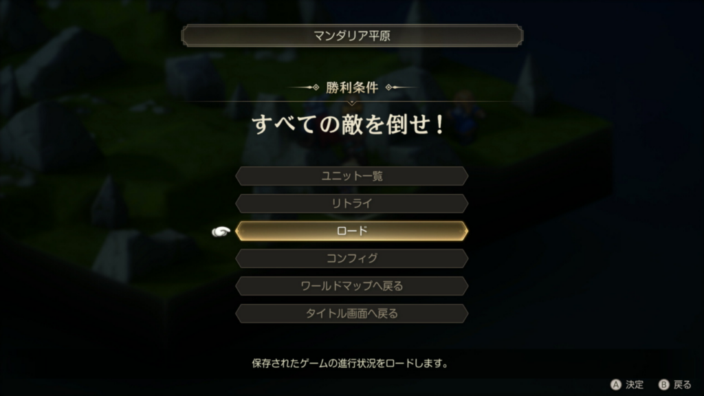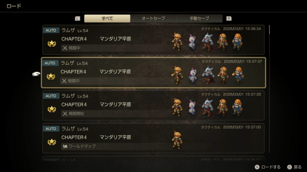 ⑤ロードを選択し、上から2番目のオートセーブデータを選択します。