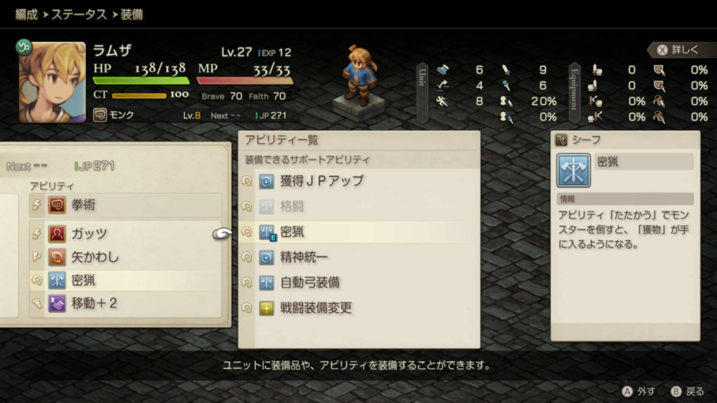 密猟するには、シーフのサポートアビリティ密猟(JP200)を取得してセットします。
